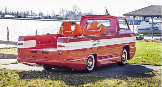 This seafaring Corvair was based on a brand-new Rampside pickup with a 65-horsepower engine and automatic transmission. Its producers sealed off the undercarriage, installed engine and rudder controls in the truck bed, and got to floatin'. By the way now it shows a mere 157 miles. And you can bid for this Corvair in January on the auction.